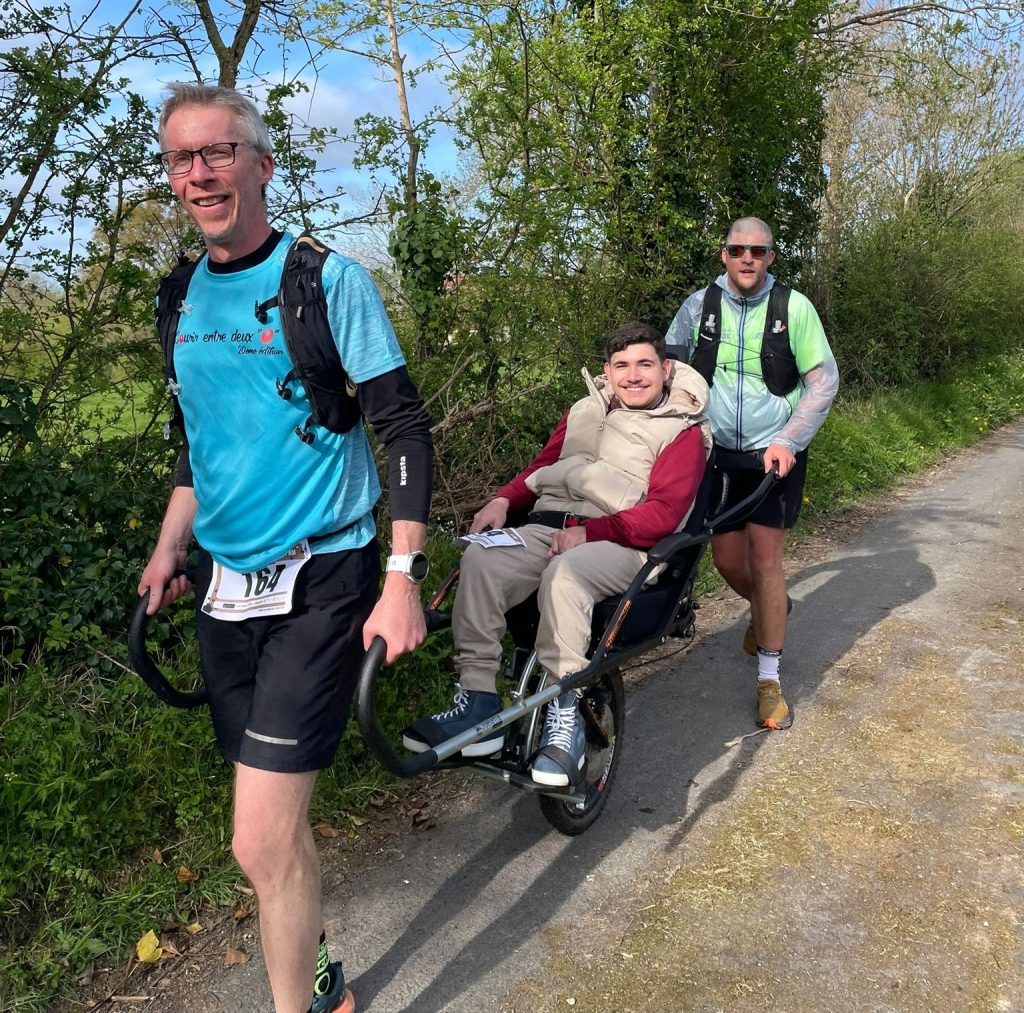 2 sportifs en Joëlette (Alain et Loris) et 1 sportif en quadrix (Wilfried).